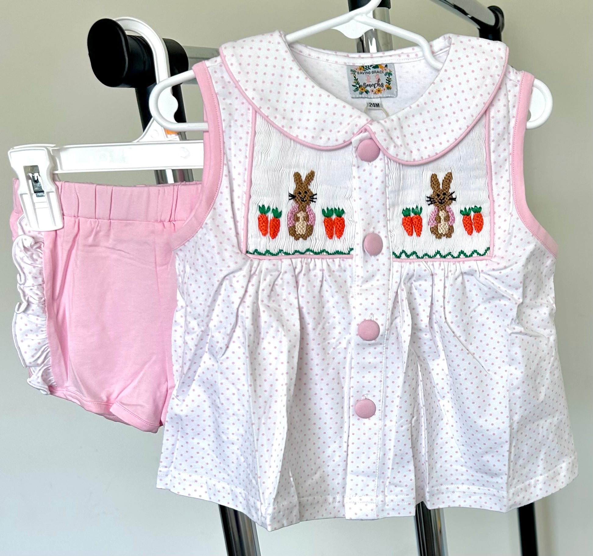 Light Pink and Bitty Dots Bunny and Carrots Smocked Chest