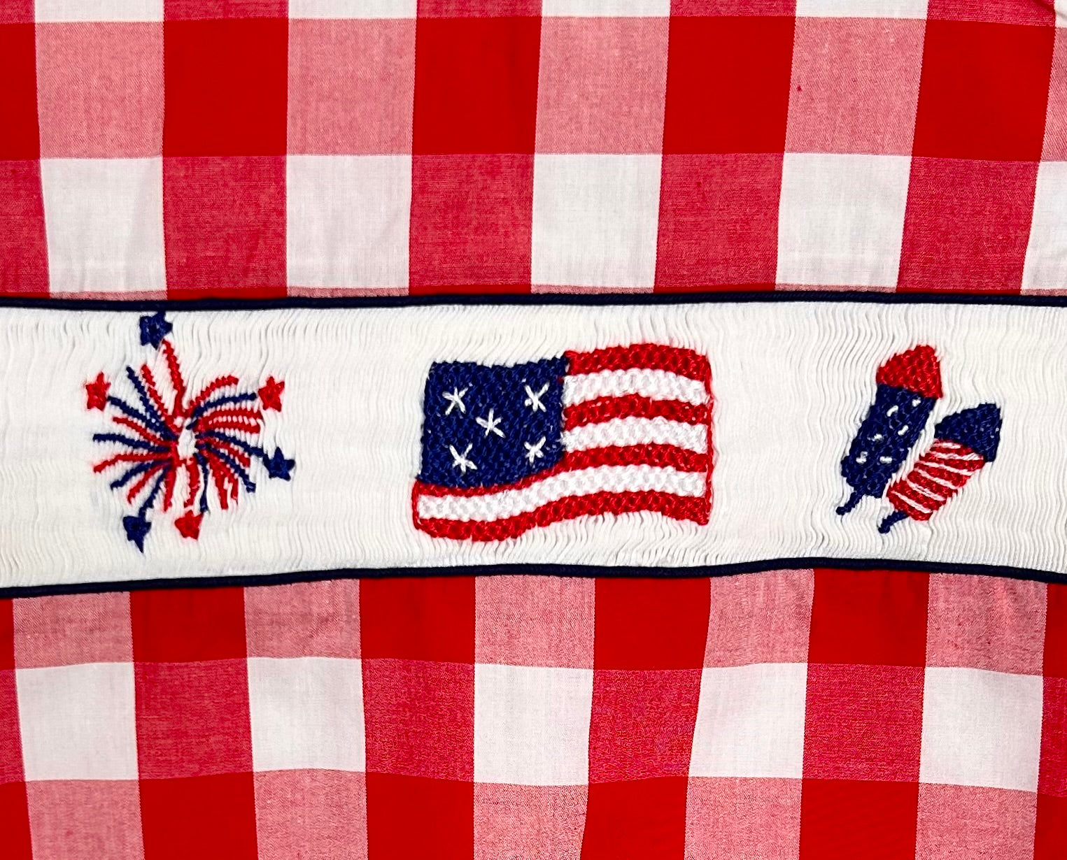 Red Windowpane and Navy Fireworks, Flag, Rockets Smocked Trio